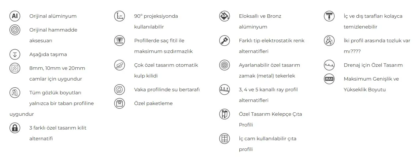 Ray ve Eşik Seçenekleri: 3’lü, 4’lü ve 5’li ray seçenekleri mevcuttur. Mekana göre Eşikli veya Eşiksiz alüminyum tercih edilebilir.